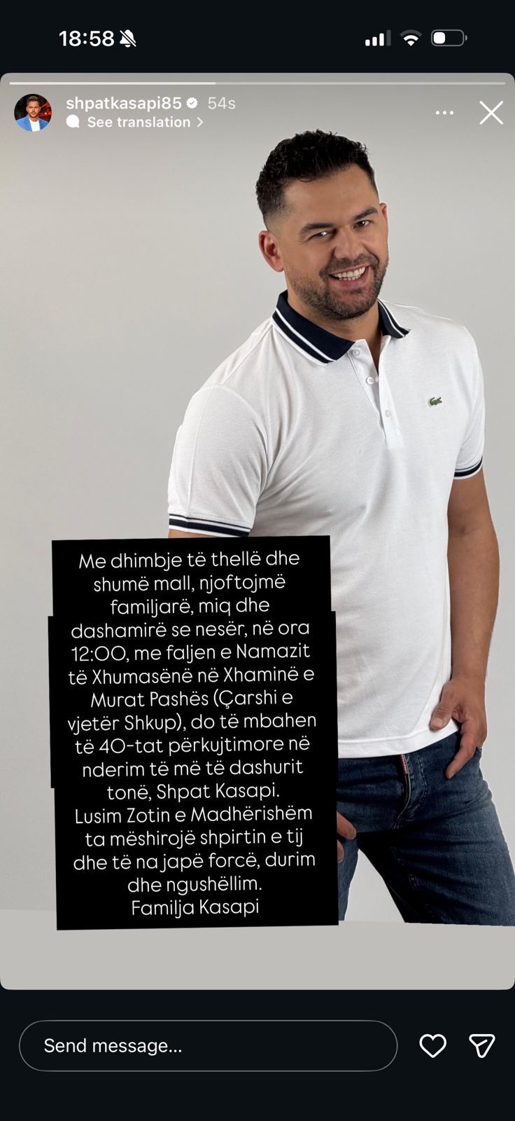 Familja e këngëtarit të mirënjohur shqiptar, Shpat Kasapi, ka njoftuar përmes llogarisë së tij zyrtare në Instagram mbajtjen e ceremonisë përkujtimore të 40 ditëve nga ndarja e tij nga jeta.