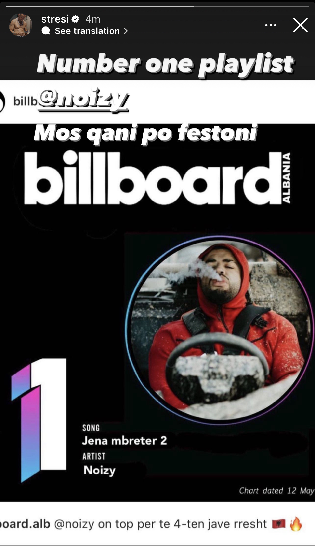 Stresi, duket se lumturohet për sukseset individuale të  Noizy-t, i cili së fundmi ka arritur sukses pasi kënga e tij ka arritur numër një në top-lista. Stresi ndihet krenar për mikun e tij, duke ndarë rezultatin e duke shkruar: Number one playlist, mos qani por festoni.