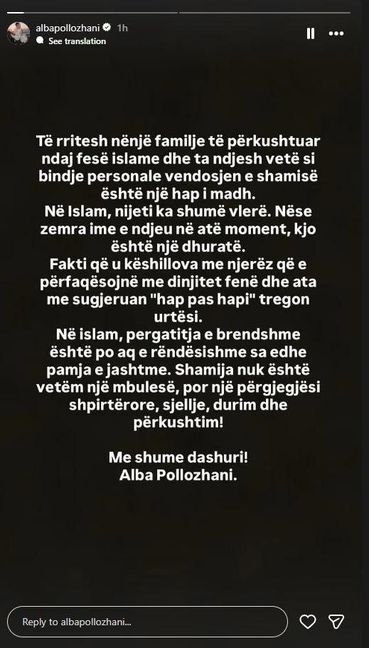 Pas këtij momenti televiziv, Alba ka zgjedhur t’i sqarojë më qartë ndjesitë dhe arsyet e saj përmes një InstaStory, ku flet për procesin personal dhe shpirtëror që po përjeton. Ajo thekson se ky vendim nuk lidhet me presionin e jashtëm apo me momentin, por është i rrënjosur thellë në edukimin dhe bindjet e saj.