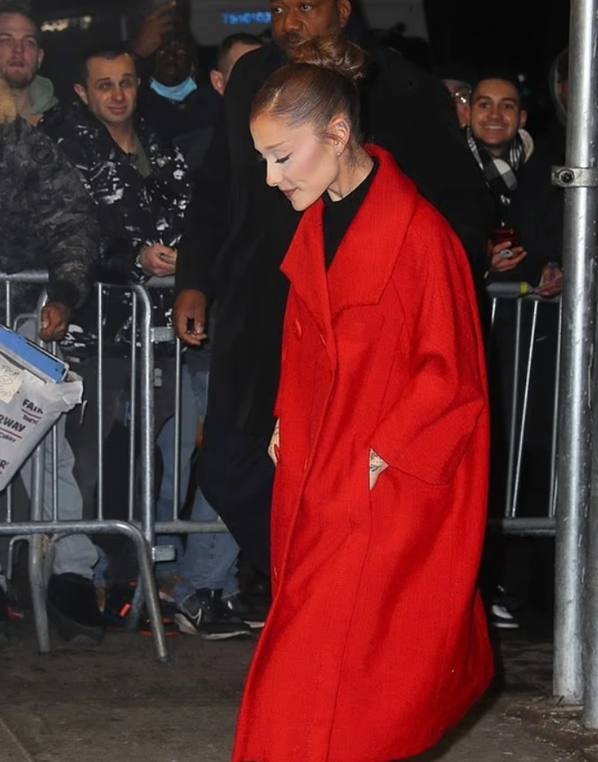 Ariana Grande u pa të mërkurën në New York, duke shkëlqyer me një pallto të gjatë dhe të kuqe festive, ndërsa shkonte në shfaqjen e filmit Wicked: For Good. Përpos palltos, këngëtarja kishte veshur një bluzë të zezë dhe pantallona të ngushta, të cilat i kombinoi me çizme të zeza me taka të larta. Flokët e saj ishin kapur prapa dhe grimi delikat nxirrte në pah tiparet e saj, ndërsa përshëndeste fansat jashtë teatrit.
