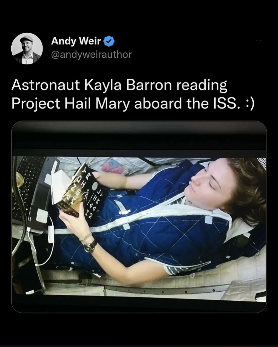 Një foto e astronautes Kayla Barron nga misioni i saj i vitit 2021 në Stacionin Ndërkombëtar Hapësinor është rishfaqur së fundmi, ku ajo po lexonte librin fantastiko-shkencor të Andy Weir “Project Hail Mary “, i cili u publikua atë vit. E vërteta është se astronauti mesatar nuk ka shumë kohë të lirë , por letërsia mund të udhëtojë lehtësisht jashtë stratosferës, dhe për këtë arsye ka shumë raste kur kemi parë anëtarë të misioneve hapësinore duke lexuar libra, qoftë për kënaqësinë e tyre ose për argëtimin e të tjerëve.