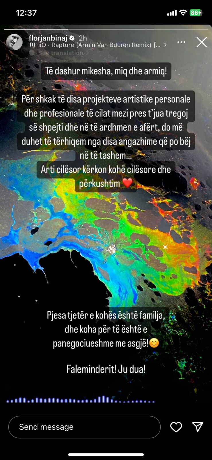 “Të dashur mikesha, miq dhe armiq! Për shkak të disa projekteve artistike personale dhe profesionale të cilat mezi pres t’ju tregoj së shpejti dhe në të ardhmen e afërt, do më duhet të tërhiqem nga disa angazhime që po bëj në të tashmen…Arti cilësor kërkon kohë cilësore dhe përkushtim. Pjesa tjetër e kohës është familja dhe koha për të është e panegociueshme me asgjë! Faleminderit! Ju dua!”, përfundon postimi.