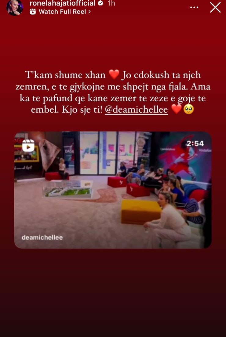 Këngëtarja e njohur, Ronela Hajati ka dalë në mbështetje të Dea Mishel Hoxhës, pas kërkesës së fjaljes që bëri kjo e fundit sot në shtëpinë e ‘Big Brother VIP Albania’. Ronela, ka ripostuar videon e momentin kur Dea kërkon falje për batutën për fëmijët jetim. Ronela, shkruan se e ka shumë xhan Dean, e se jo të gjithë ia njohin zemrën.