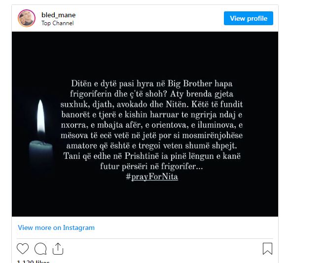 “Ditën e dytë pasi hyra në Big Brother hapa frigoriferin dhe ç’të shoh? Aty brenda gjeta suxhuk, djathë, avokado dhe Nitën. Këtë të fundit banorët e tjerë e kishin harruar te ngrirja ndaj e nxora, e mbajta afër, e orientova, e iluminova, e mësova të ecë vetë në jetë por si mosmirënjohëse amatore që është e tregoi veten shumë shpejt. Tani që edhe në Prishtinë ia pinë lëngun e kanë futur përsëri në frigorifer. Lutem për Nitën”-shkruan ai.