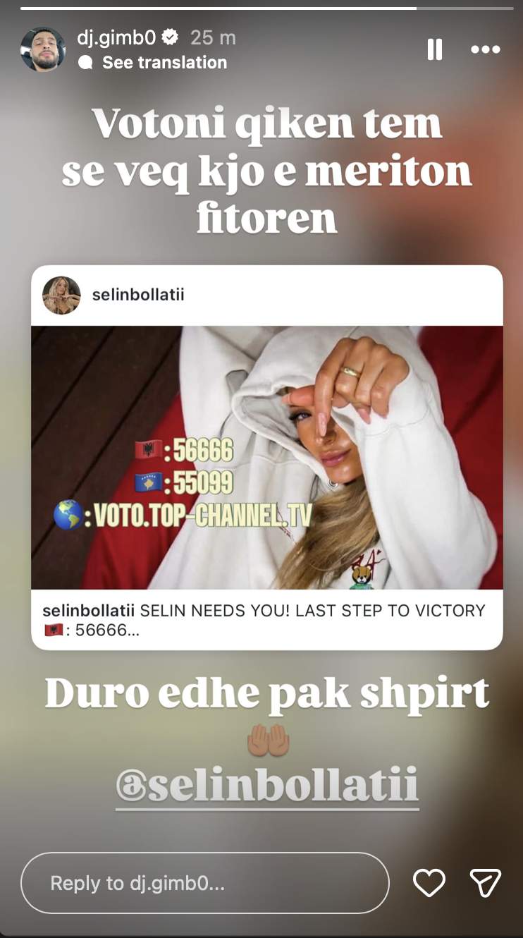 Por DJ Gimbo nuk është ndalur vetëm te thirrja për votim. Ai ka shtuar edhe një mesazh emocional drejtuar vetë Selin, duke i dhënë kurajo për ditët e fundit të garës: