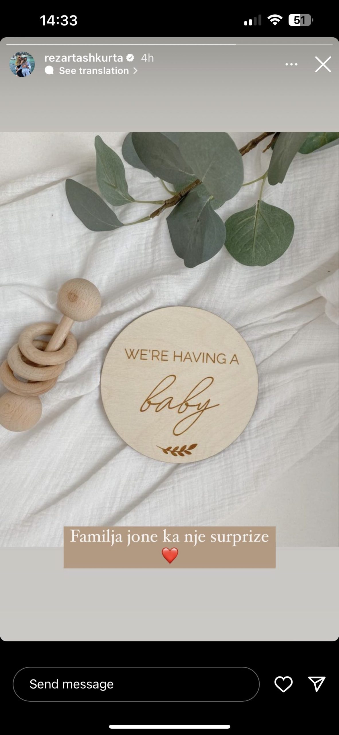 “Familja jonë ka një surprizë“, ka shkruar Rezarta krah një fotoje të publikuar në “Instastory” ku bën të ditur se është në pritje të një bebi.