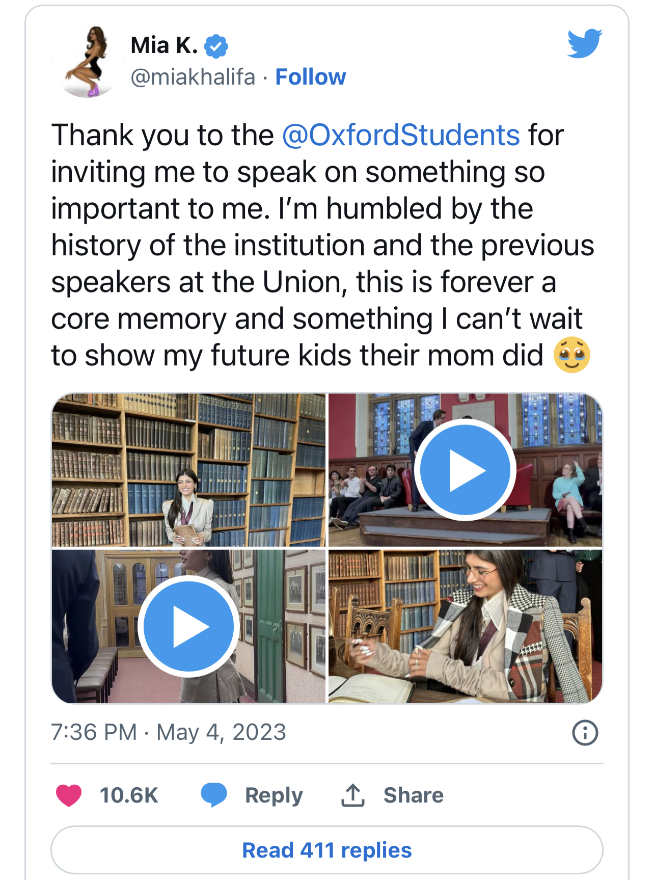 “Për mua do të jetë gjithmonë një kujtim fantastik dhe diçka që mund t’ia tregoj fëmijëve të mi në të ardhmen. Falënderoj universitetin që më dha mundësinë të flas në një godinë kaq historike. Ndihem e nderuar dhe e frymëzuar për pasionin që ka ky universitet për të sjellë ndryshimin e vërtetë në botë dhe që përzgjedh një listë kaq të diversifikuar të oratorëve”, shkruan Mia Khalifa në Twitter.