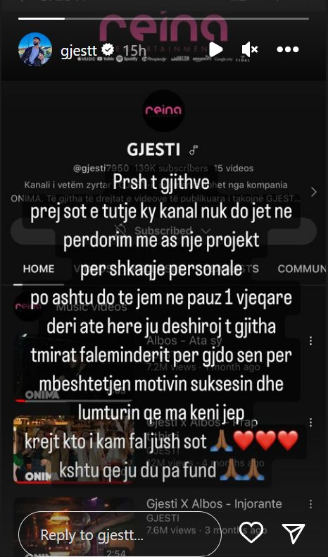 “Përshëndetje të gjithëve, prej sot e tutje ky kanal nuk do të jetë në përdorim me as një projekt për shkaqe personale, po ashtu do të jem në pauzë njëvjeçare, deri atëherë ju dëshiroj të gjitha të mirat, faleminderit për çdo gjë, për mbështetjen, motivin, suksesin dhe lumturinë që ma keni dhënë, të gjitha këto i kam fal jush sot, kështu që ju dua pafund”, ka shkruar Gjesti.