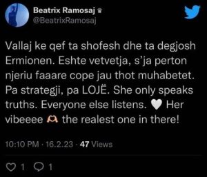 “Vallaj ke qef ta shofesh dhe ta degjosh Ermionen. Eshte vetvetja, s’ja perton njeriu faaare cope jau thot muhabetet. Pa strategji, pa LOJË. She only speaks truths. Everyone else listens. Her vibeeee! The realest one in there!”- shkruan Beatrix.