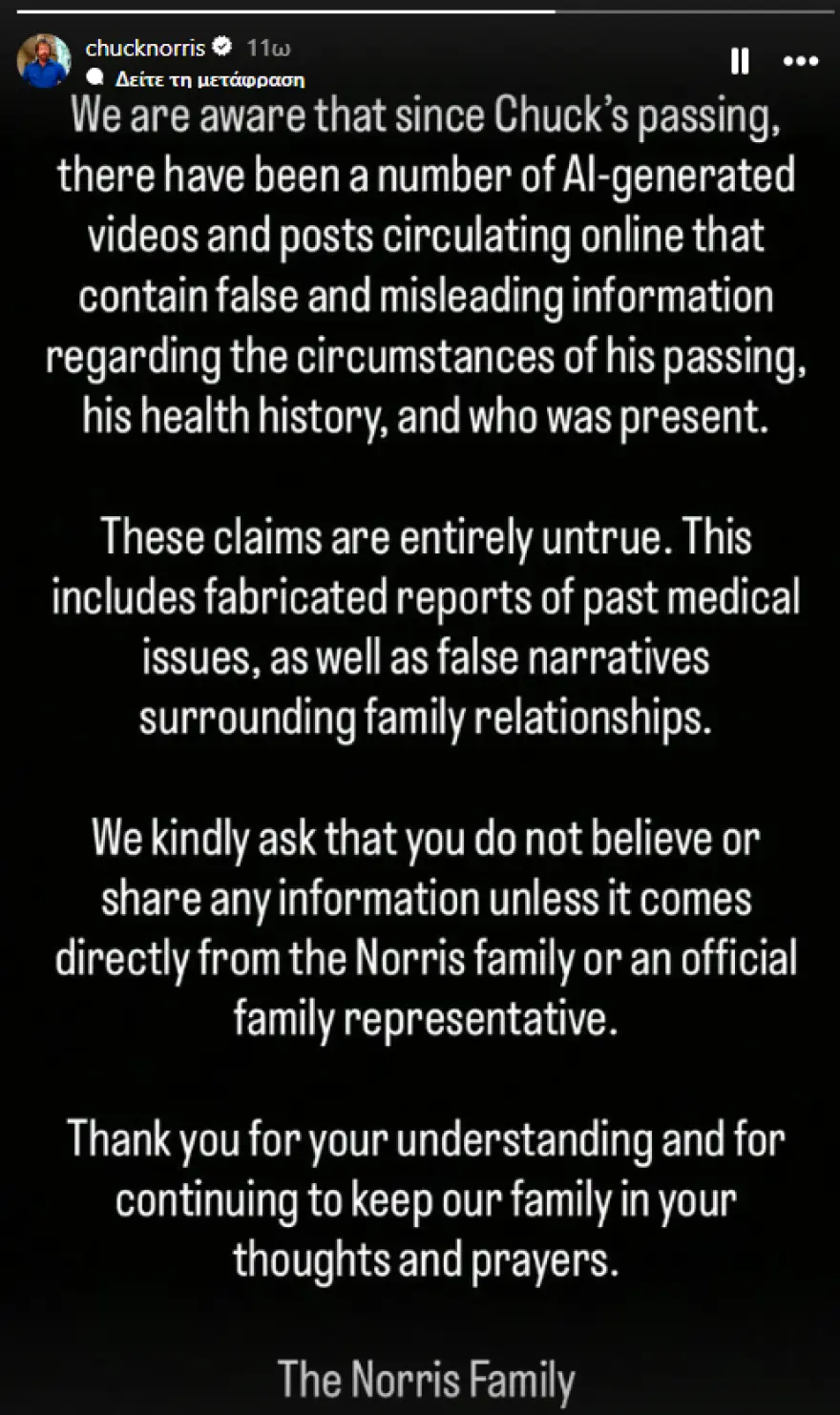 “Jemi të vetëdijshëm se që nga vdekja e Chuck Norris, në internet kanë qarkulluar video dhe postime të shumta që janë krijuar duke përdorur inteligjencën artificiale dhe përmbajnë informacione të rreme dhe mashtruese në lidhje me rrethanat e vdekjes së tij, historinë e tij mjekësore dhe se kush ishte i pranishëm. Këto pretendime janë plotësisht të pavërteta. Kjo përfshin raporte të sajuara për probleme mjekësore të kaluara, si dhe rrëfime të rreme rreth marrëdhënieve familjare. Ju kërkojmë të mos besoni ose ndani asnjë informacion përveç nëse vjen direkt nga familja Norris ose një zëdhënës zyrtar. Faleminderit për mirëkuptimin tuaj dhe që vazhdoni ta mbani familjen tonë në mendimet dhe lutjet tuaja. Familja Norris .”