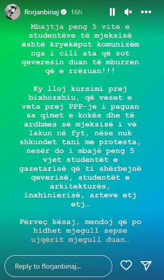 Kësaj here, Binaj ka reaguar për padrejtësinë e qeverisë me studentët e mjekësisë, që duan t’i mbajnë “peng” 5 vite në Shqipëri, që t’u japin diplomën.