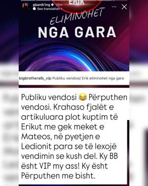 Eliminimi i Erikut nga Big Brother VIP Albania ka shkaktuar reagime të shumta në rrjete sociale, por një nga më të zhurmshmet ka qenë ai i reperit G Bani. Përmes një postimi ironik dhe kritik, ai ka vënë në pikëpyetje jo vetëm vendimin e publikut, por edhe standardet e këtij edicioni të BB VIP.