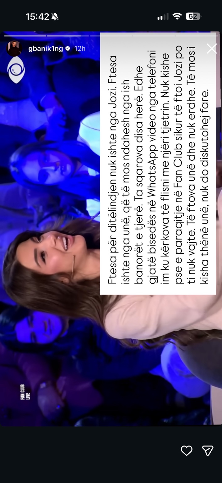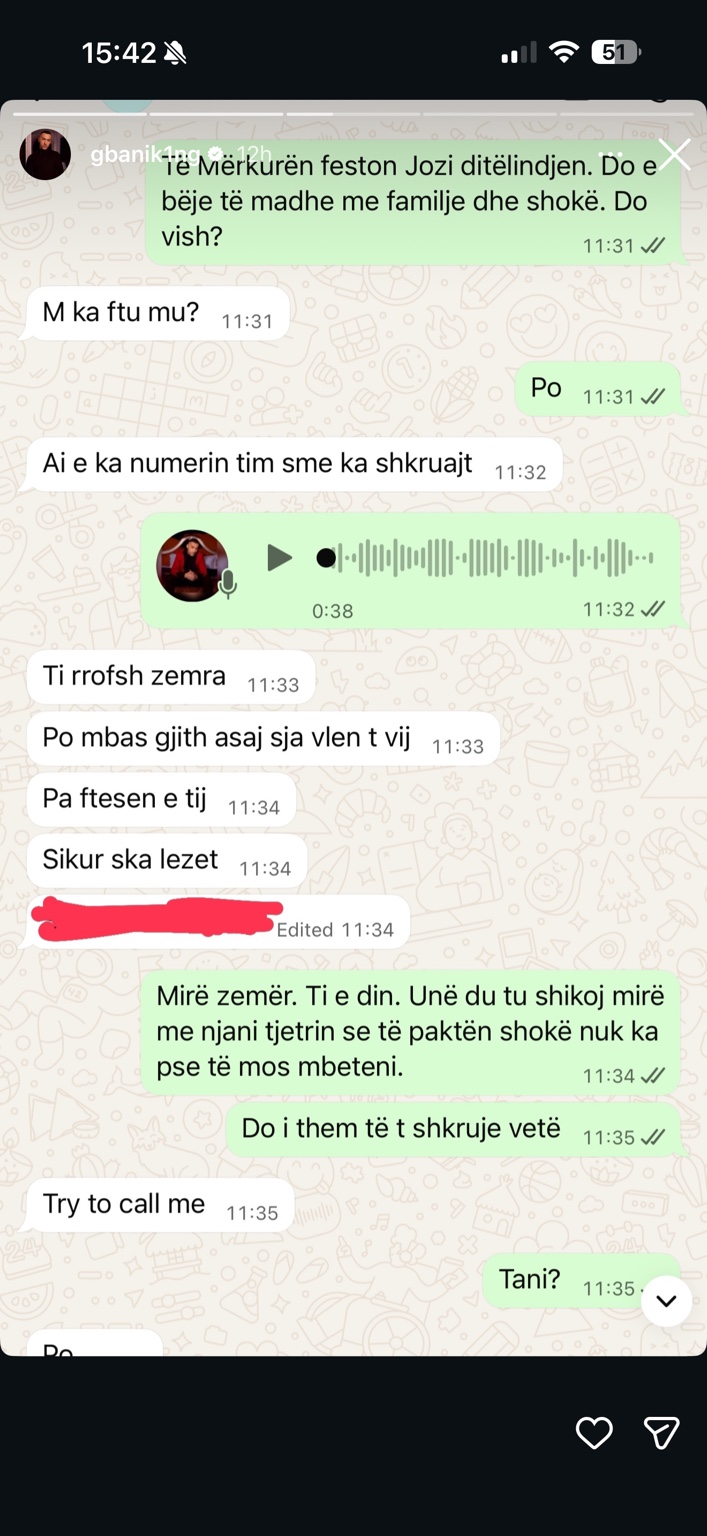 Një tjetër zhvillim i bujshëm ka dalë në pah në rrjetet sociale, pasi G Bani ka vendosur të publikojë disa biseda private me Loredana Bratin, duke sqaruar se ishte ai qe e ftoi ish banoren e “BBVA” ne ditelindjen e Jozit.