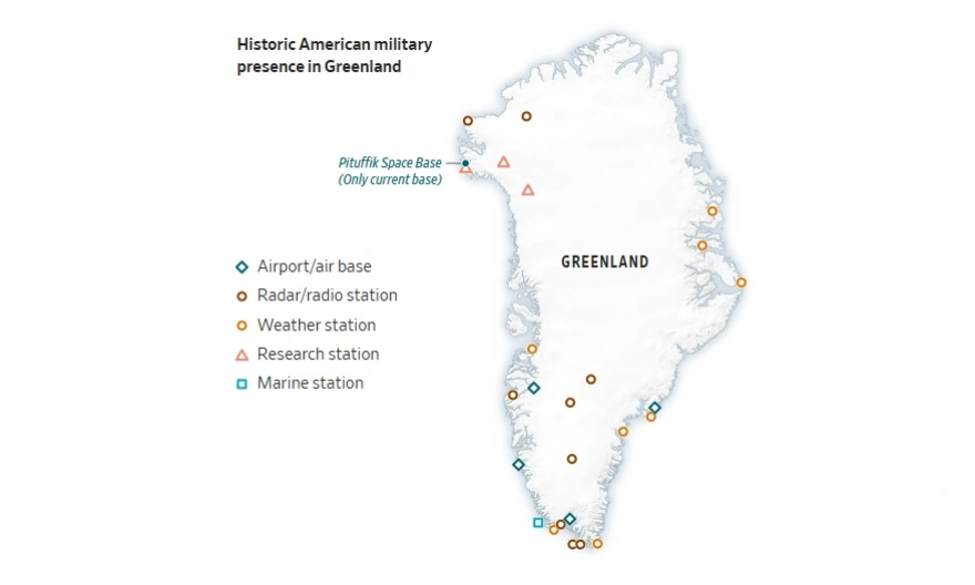 Gjatë Luftës së Ftohtë, Shtetet e Bashkuara dhe aleatët e saj kishin baza ushtarake në të gjithë Groenlandën. Forcat e vendosura atje monitoronin anijet dhe nëndetëset sovjetike dhe ishin të gatshme të mbronin ishullin në rast të një pushtimi ose sulmi. Sot, prania ushtarake amerikane është zvogëluar ndjeshëm, me rreth 150 ushtarë të mbetur në ishull, një numër i reduktuar ndjeshëm nga kulmi prej rreth 15,000 trupash të vendosura në të kaluarën.