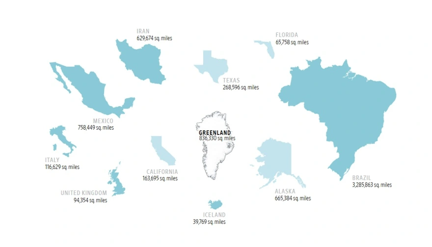 Groenlanda është më e madhe se Kalifornia dhe Meksika dhe pothuajse katër herë më e madhe se Teksasi.
