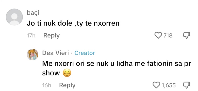 Por ajo çfarë ra në sy të të gjithve ishte një replikë e saj tek një person i panjohur ku thoshte: ‘Më nxorri Ori se nuk u lidha me Fationin sa për show’ , shoqëruar kjo me një emoji të mërzitur.