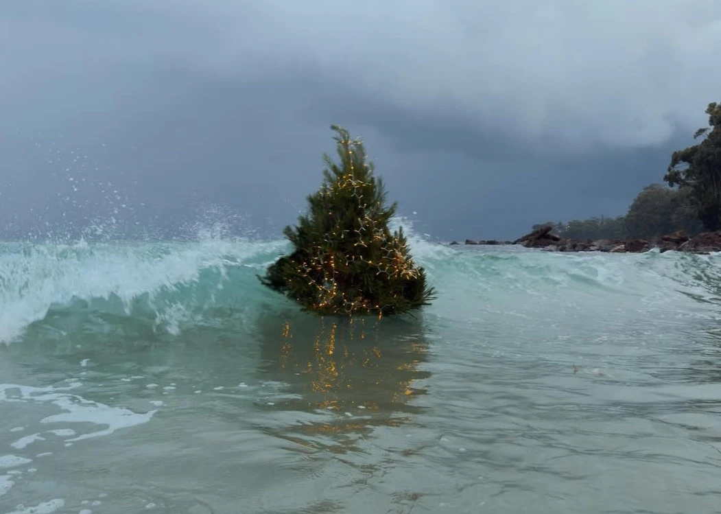 Një video bëri xhiron e Instagramit dhe u bë menjëherë e njohur. Një pemë Krishtlindjesh, e zbukuruar me drita, noton në një det të stuhishëm. Valët e vënë në provë, moti duket kërcënues, megjithatë pema mbetet aty, e ndriçuar dhe drejt, në një mjedis që duket pothuajse sureal.