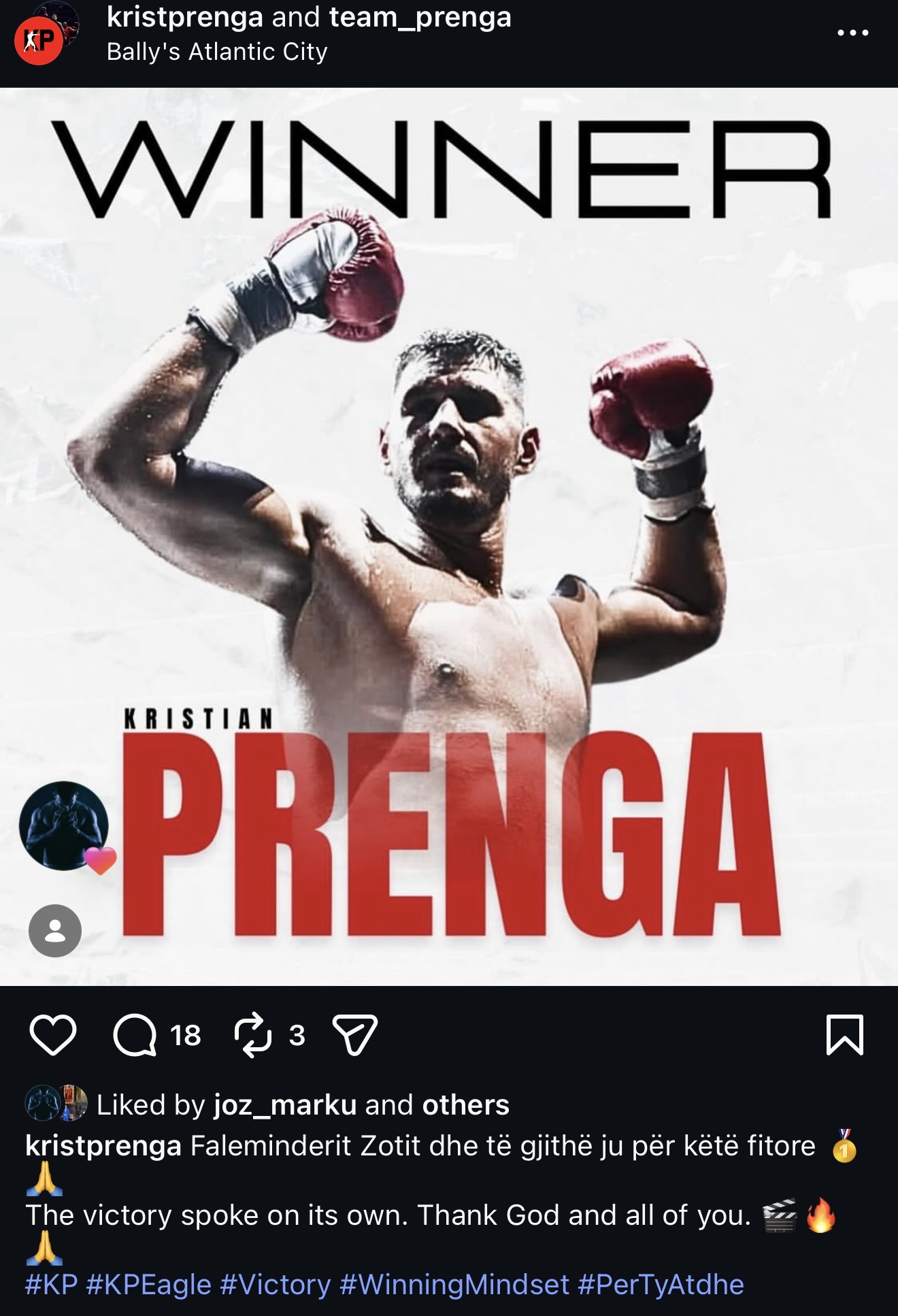 Triumfi i tij ndezi dhe elektrizoi arenën e boksit Bally’s Atlantic City ku shqiptarët e Amerikës e duartrokiten me krenari të madhe për bashkatdhetarin e tyre. Fitorja e Prengës jo vetëm e rrit rekordin e tij personal, por edhe e forcon pozicionin e tij si një prej emrave më premtues të boksit shqiptar në arenën ndërkombëtare.