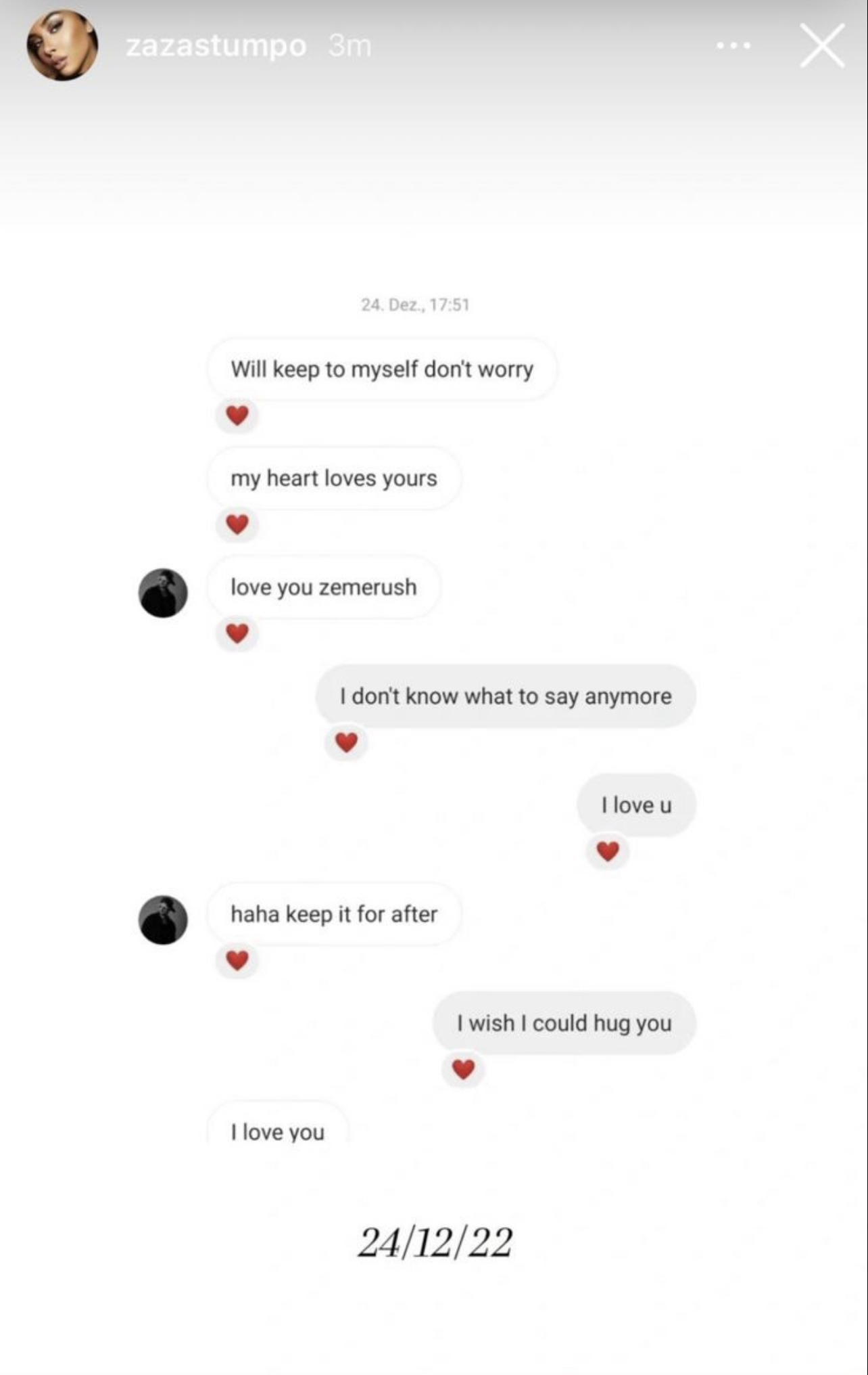 Kjo deklaratë nuk është pritur aspak mirë nga Zaza, e cila ka publikuar bisedën e tyre të fundit, 4 orë para se Kristi të bëhej pjesë e shtëpisë së “Big Brother VIP”, në 17:51. Nga biseda, dyshja nuk duken të ndarë, madje është një bisedë me shprehje ndjenjash.