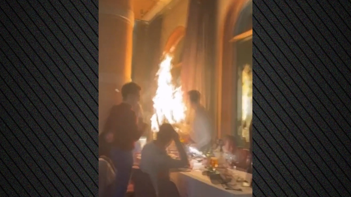 Pamjet tregojnë një perde që merr flakë ndërsa klientët e restorantit mbajnë fishekzjarre brenda dhe i tundin ato sipas ritmit të muzikës, ndërsa valltarët performojnë një shfaqje në bar.