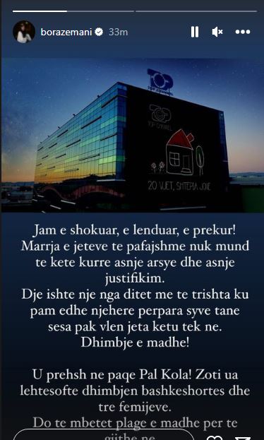 Moderatorja e ‘Përputhen’, Bora Zemani ka reaguar për ngjarjen që ndodhi dy ditë më parë në Top Channel, ku mbeti i vrarë roja i godinës, 60-vjeçari Pal Kola. Përmes dy shkrimeve të postuara në ‘instastory’, Bora thotë se ka mbetur e shokuar dhe e lënduar nga ajo që ndodhi. Moderatorja shkruan se pas ngjarjes së rëndë, i duhet dhënë mbështetje e madhe televizionit.
