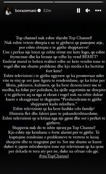 “Top Channel nuk është thjesht Top Channel! Nuk është vetëm shtëpia e ne të gjithëve që punojmë atje, por është shtëpia e të gjithë shqipëtarëve! Unë i përkas një brezi që është rritur me këtë logo, që është frymëzuar dhe ka besuar që edhe ky vend BËHET! Ëndrrat mund të bëhen realitet edhe në këtë vendin tonë të vogël dhe me shumë probleme dhe kjo media e ka bërtitur fort këtë! Është televizioni i të gjitha ngjyrave që ka promovuar ndër vite të rinj që sot janë figura të rëndësishme, që ka folur për librin, pikturën, kulturën, që ka bërë denoncimet më të mëdha, ka folur për politikën, ka sjellë argëtimin në shtëpitë e të gjithëve aq sa nga ai ekran i vogël nuk na është dukur kurrë e ekzagjeruar të dëgjojmë “Përshëndesim të gjithë shqiptarët kudo ndodhen.” Është telvizioni që ka bërë bashkë çdo familje! Historia flet dhe faktet janë të pakundershtueshme. Është televizioni që u krijua nga një gjeni dhe sot i përket të gjithëve. Shqipëria nuk do të ishte njësoj pa Top Channel! Kjo është një këmbanë e fortë alarmi për të gjithë. Të kuptojmë rëndësinë e problemeve të vërteta të kësaj shoqërie dhe të reagojmë për to. Sot më shumë se kurrë duhet t’i japim mbështetjen tonë një televizioni që ka qenë për dekada të tëra aty për ne, duke na ofruar çdo gjë. Me Top Channel.”