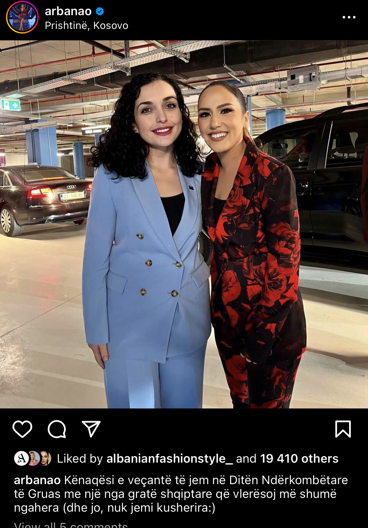 Në Ditën Ndërkombëtare të Gruas, Arbana Osmani ka zgjedhur të ndajë një foto me presidenten e Kosovës, Vjosa Osmanin. Moderatorja e cilëson Osmanin si një nga gratë shqiptare më me vlera.