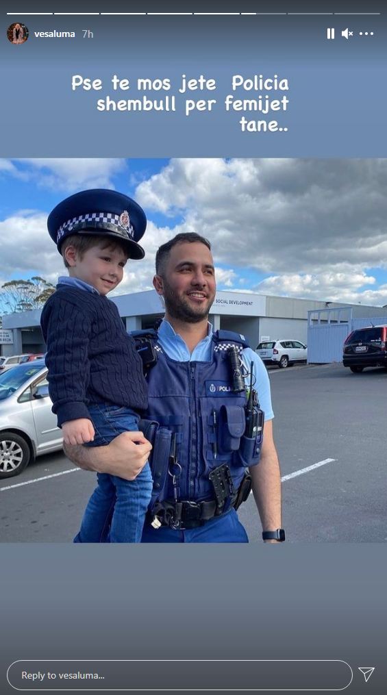 Më tej, Vesa publikon foto të të birit me policë në Zelandën e Re, ndërsa kërkon që polica të jetë shembull për brezat e të ardhmes.