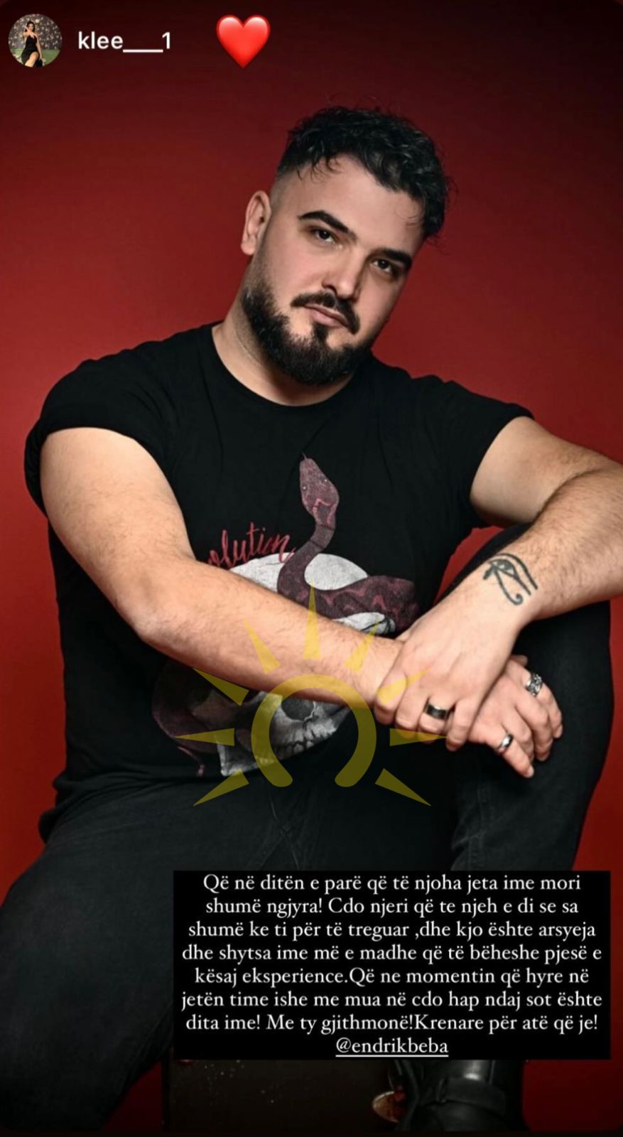 Por tashmë ai është i martuar me një vajzë që quhet Klea dhe ka një djalë 7-vjeçar, që e ka nga një marrëdhënie e mëparshme. Klea ka postuar në Instastory-n e saj një dedikim mjaft emocionues për partnerin e saj, Endrikun. Ja çfarë mendon ajo në lidhje me hyrjen e tij në “BBV3”: