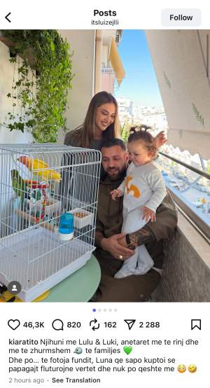 Në postim, Kiara ka shkruar: “Njihuni me Lulu & Luki, anëtarët më të rinj dhe më të zhurmshëm 🐦 të familjes 💚.” Po ashtu, në foton e fundit të postuar, Luna duket se sapo ka kuptuar se papagajt fluturojnë dhe, ndërsa i shikon ata, nuk po qesh më, duke kapur një moment shumë të ndjerë dhe të paçmuar për familjen.![]()