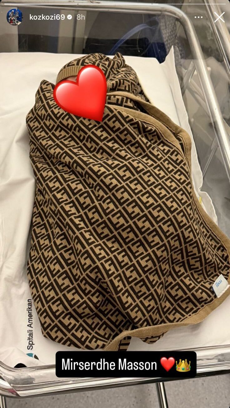 Në postim, ai ka publikuar foton e parë të foshnjës së porsalindur, e mbështjellë ngrohtësisht me një batanije në ambientet e spitalit. Portreti i të voglit është mbuluar me një emoji zemre të kuqe për të ruajtur privatësinë.