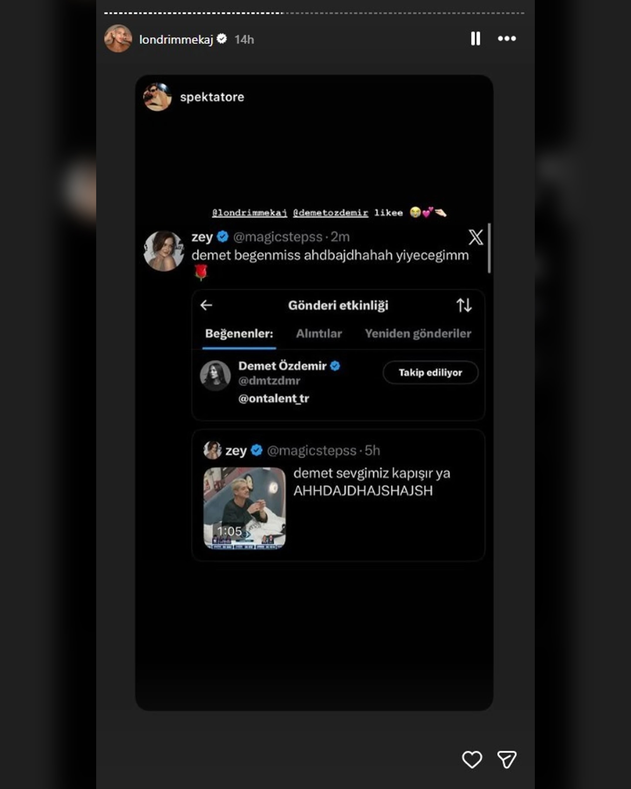 Ajo që askush nuk e priste ishte reagimi i vetë yllit të serialeve turke. Nga llogaria e saj zyrtare dhe e verifikuar në X, Demet Özdemir i bëri “like” njërit prej postimeve ku shpërndahej videoja e Londrimit, duke treguar se e kishte parë dhe e kishte vlerësuar këtë dedikim.