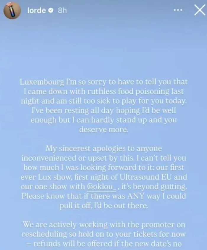“Luksemburg, më vjen shumë keq. U helmova nga ushqimi dhe nuk jam në gjendje të performoj. Ju meritoni më shumë,” shkroi Lorde. Ajo gjithashtu bëri me dije se po bashkëpunon me organizatorët për të riplanifikuar datën e koncertit dhe ofroi mundësinë e rimbursimit për ata që kishin blerë bileta.