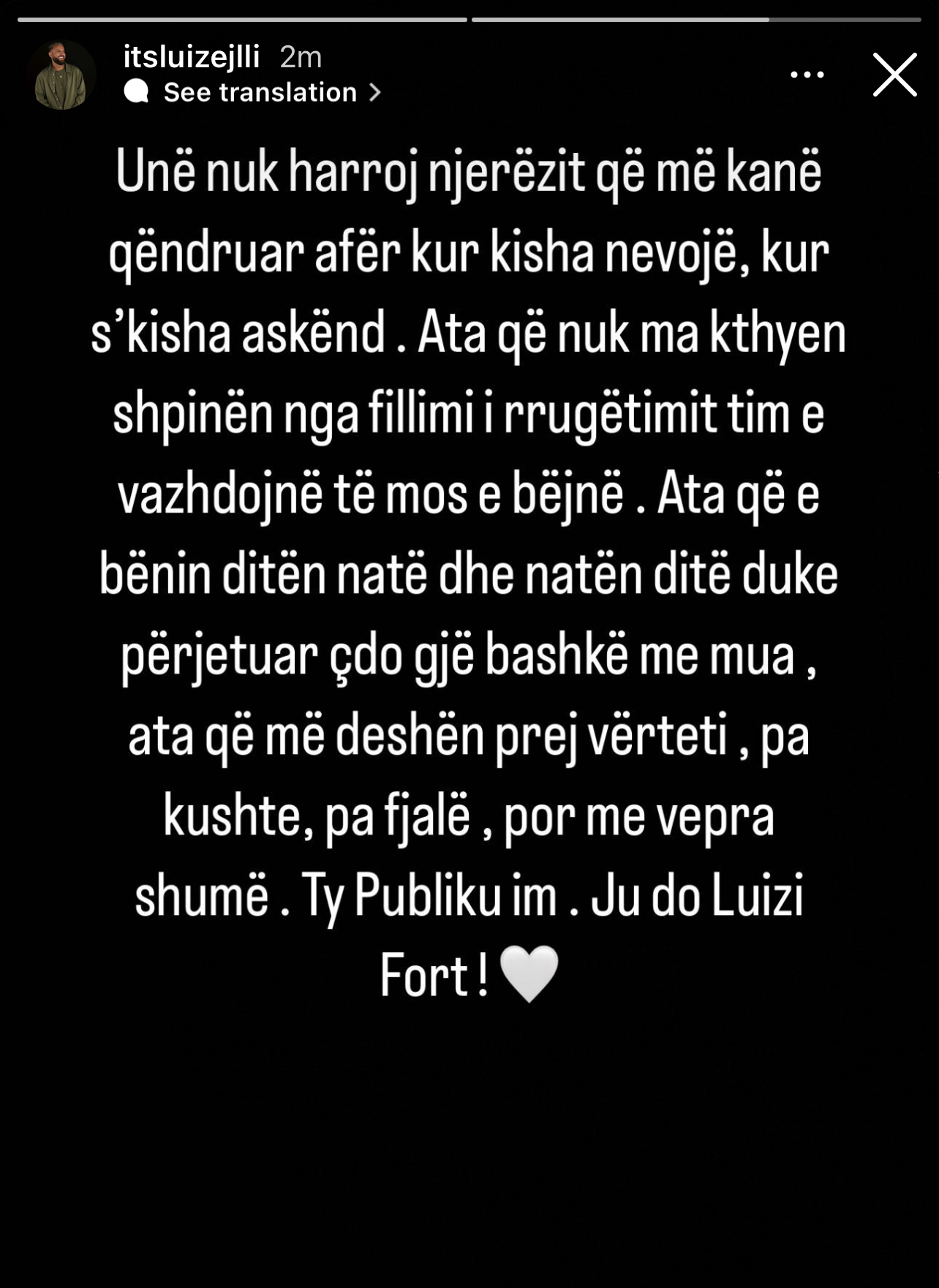 Unë nuk harroj njerezit që me kane qëndruar afër kur kisha nevoje, kur s’kisha askënd . Ata që nuk ma kthyen shpinen nga fillimi i rrugëtimit tim e vazhdojnë të mos e bejne. Ata qe e benin diten nate dhe naten dite duke perjetuar çdo gje bashkë me mua, ata qe me deshën prejvërteti , pa kushte, pa fjale, por me vepra shume. Ty Publiku im. Ju do Luizi Fort!