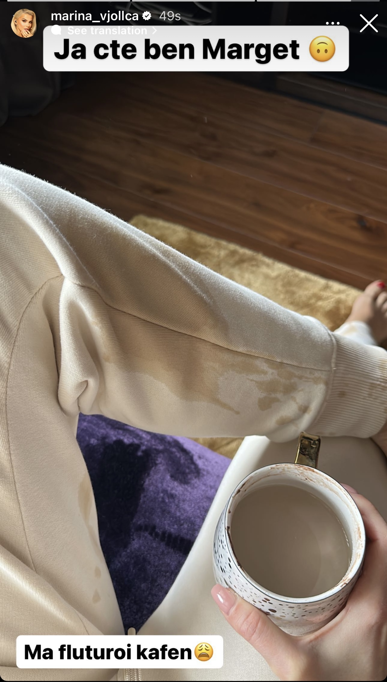 E shtuna është ditë relaksi e si e tillë shumica prej nesh e kalojnë me familjarët dhe të dashurit. Moderatorja Marina Vjollca po e kalon me të bijën Marget e cila duket se nuk ia ka bërë dhe aq të lehtë ditën. Vetë Marina ka postuar në “instastory” një foto ku shihet se iu është derdhur kafeja në tuta e mesa duket kjo e ka një fajtore: Marget.