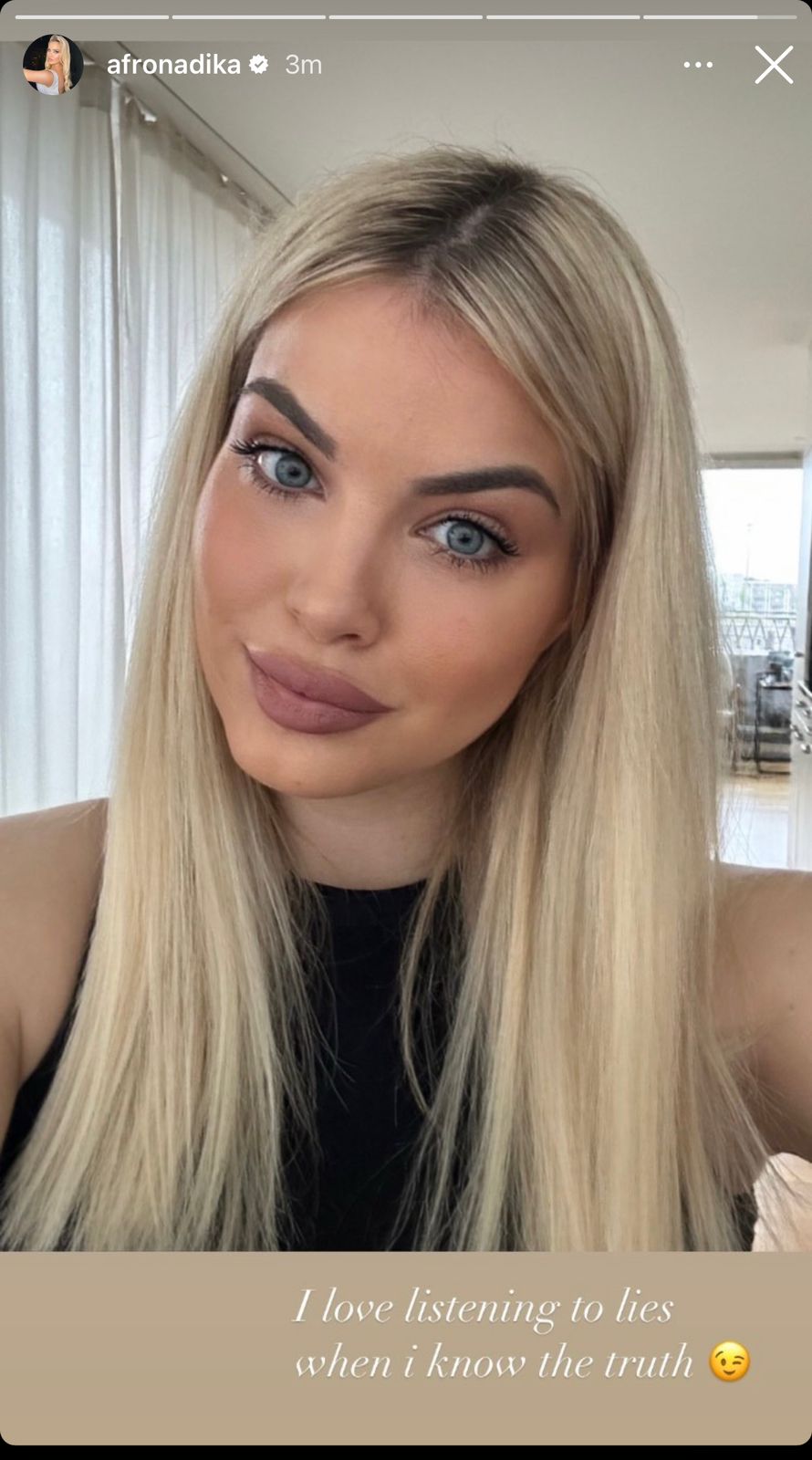 Dy ditë pas deklaratave bombastike të Bleros për ish-bashkëshorten e tij, ka reaguar edhe kjo e fundit. Mëngjesin e sotëm, Afrona Dika ka ndarë një foto në ‘instastory’ të sajën, ku përkrah saj shkruan në anglisht se i pëlqen të dëgjojë gënjeshtra kur e di të vërtetën.