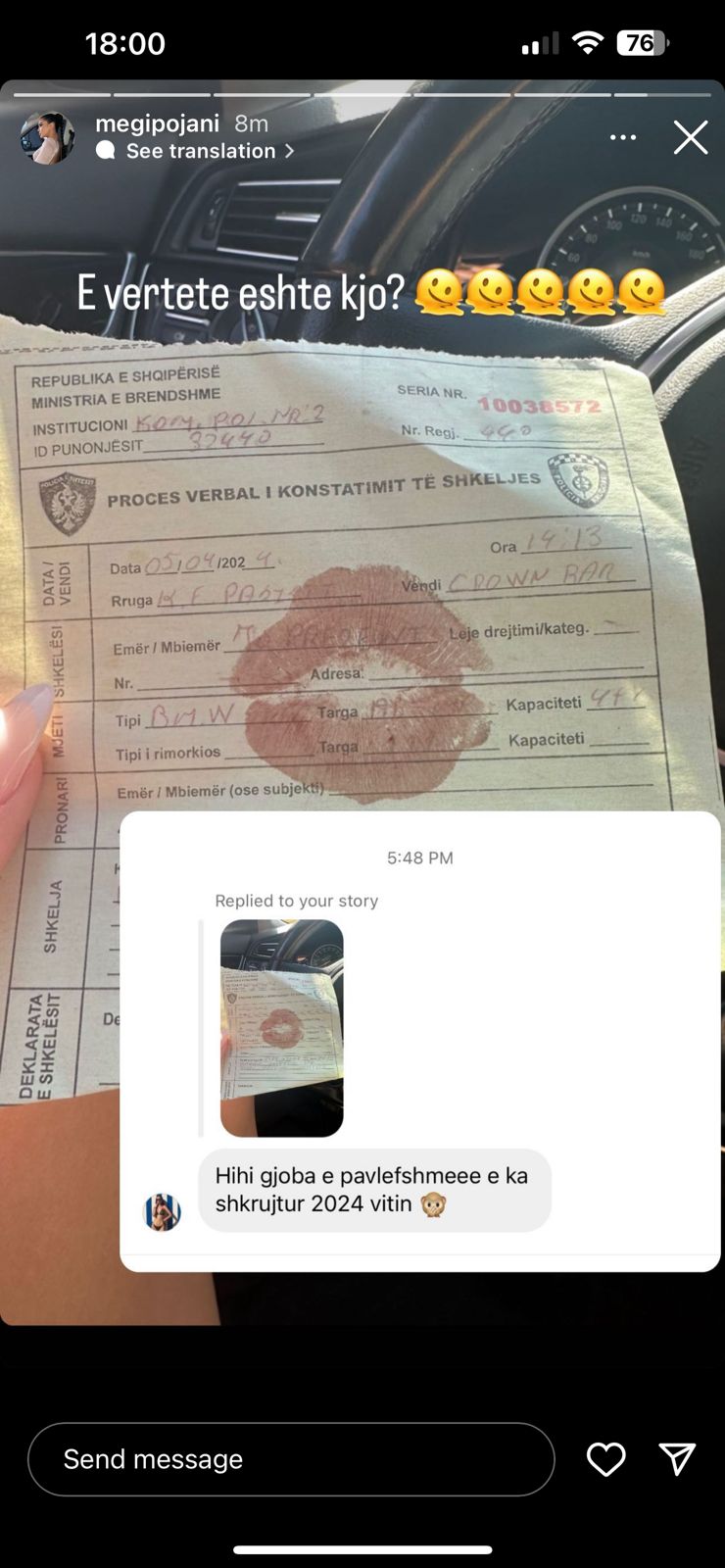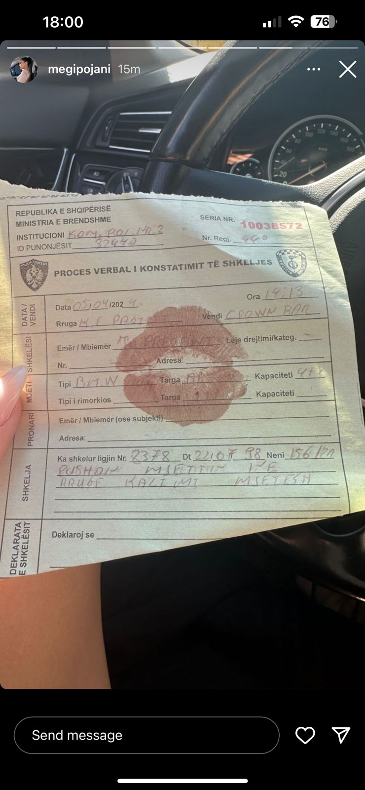 Ajo publikoi gjobën në ‘instastory’ ku lexohej se kishte ndaluar mjetin në një vend që nuk duhej. E sikur të mos mjaftonte kjo, ajo e puthi letrën duke lënë në të shenjat e buzëve.