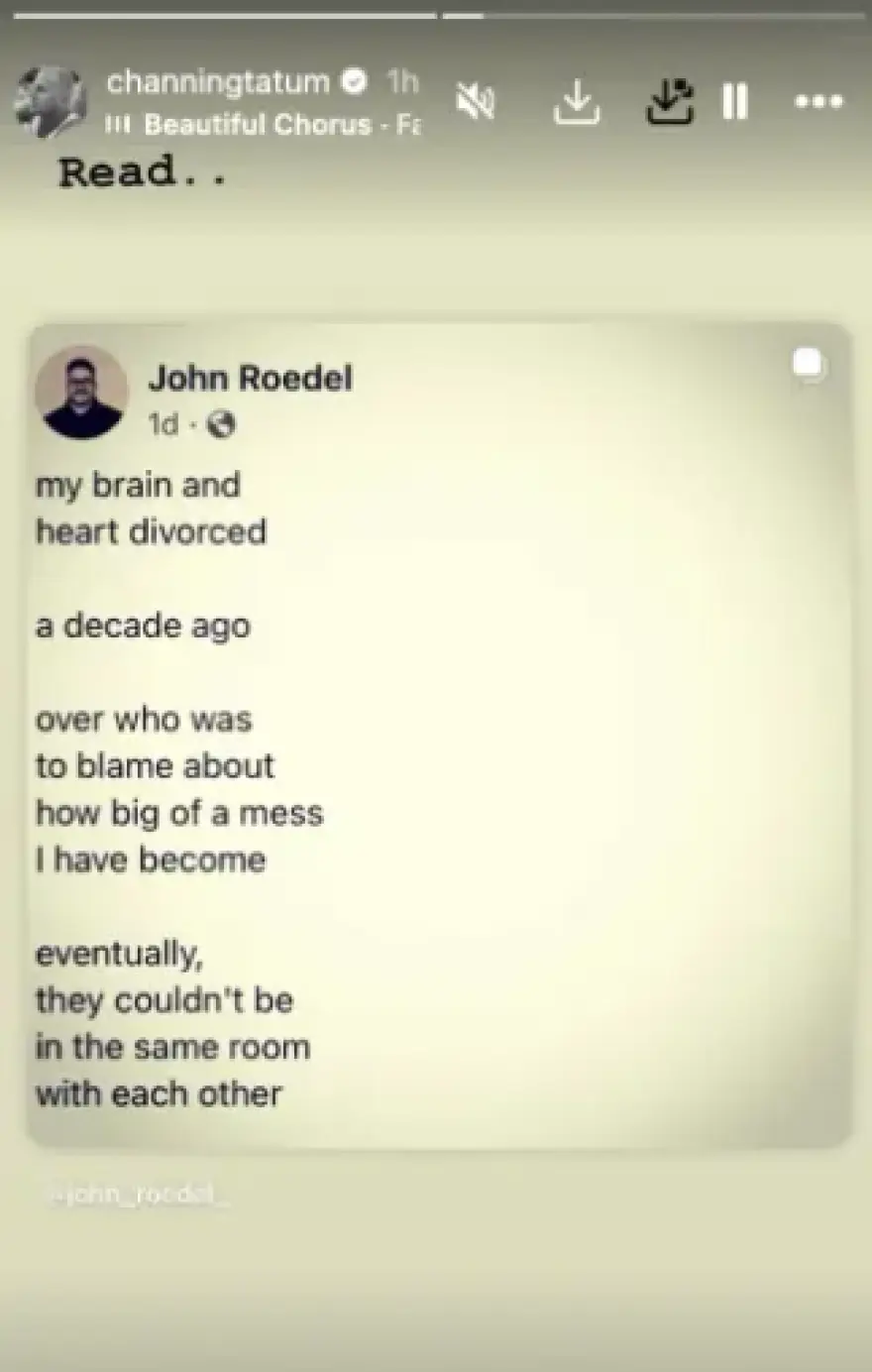 Më konkretisht, aty thuhet: “Truri dhe zemra ime u ndanë një dekadë më parë / për fajin e kujt ishte / për sa shumë isha shkatërruar / më në fund nuk mund të ishim në të njëjtën dhomë me njëri-tjetrin .” Tatum e shoqëroi historinë e tij në Instagram me këngën “Faith’s Hymn” nga Beautiful Choru.