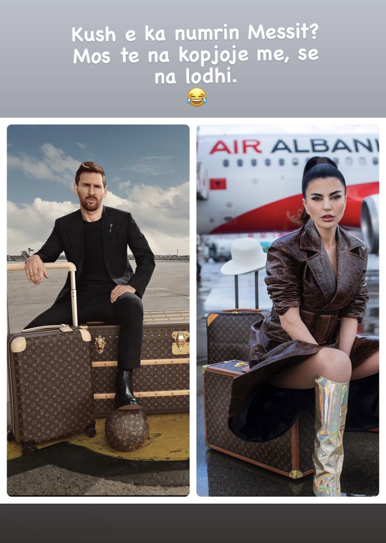 Ajo ka ndarë në “instastory” foto të sajën dhe përkrah atë të futbollistit të njohur Lionel Messit. Të dy kanë realizuar fotosesione me valixhe “Louis Vuitton” në aeroport, por koha e realizimit është e ndryshme. Rudina i ka realizuar gati 1 vit më parë, ndërsa Messi para pak javësh.