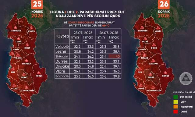 Ministria e Mbrojtjes njofton se, sipas të dhënave të raportuara në Agjencia Kombëtare e Mbrojtjes Civile IGJEUM dhe Qendrën e Koordinimit të Emergjencave Civile të BE-së (ERCC), në datën 26 Korrik pritet rrezik maksimal për zjarre në të gjitha qarqet e vendit.