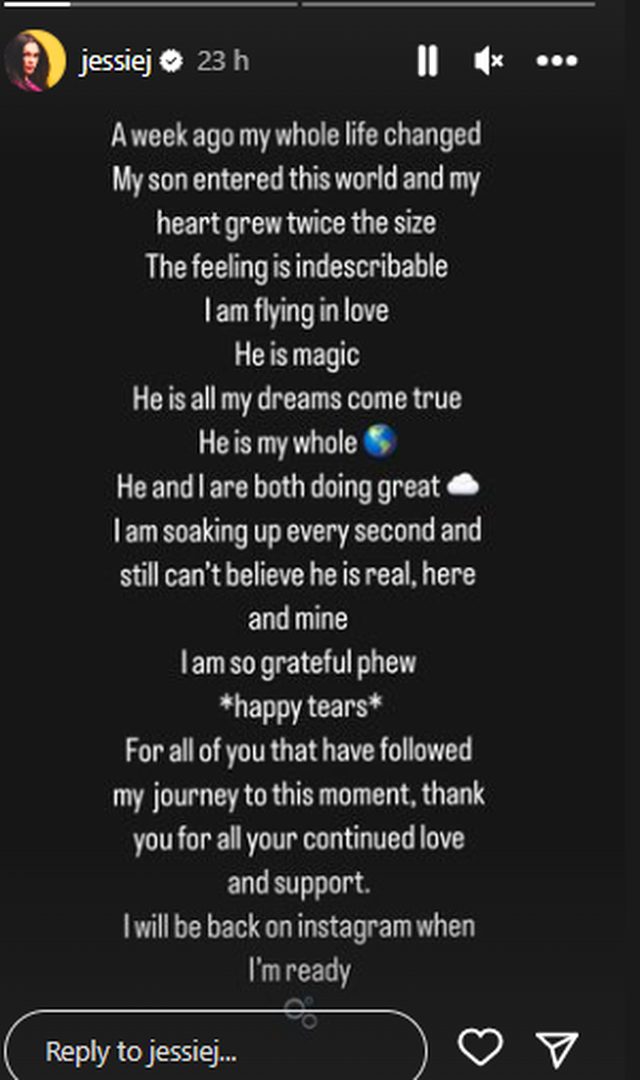 “Para një jave, e gjithë jeta ime ndryshoi. Djali im erdhi në këtë botë dhe zemra ime u zmadhua dyfish. Ndjesia është e papërshkrueshme. Po fluturoj nga dashuria. Ai është magjik. Është realizimi i të gjitha ëndrrave. Është e gjithë bota. Ai dhe unë jemi shumë mirë dhe s’e besoj dot që është i vërtetë, është këtu, me mua. Jam shumë mirënjohëse”, ka shkruar Jessie në një postim në rrjete sociale.