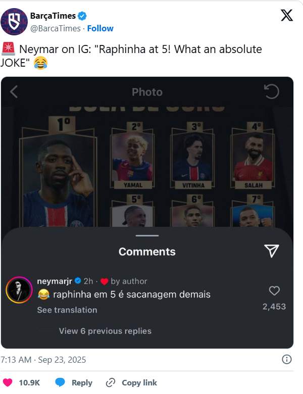 “Rafinha i pesti? Është vërtet absurde”, shkroi sulmuesi 33-vjeçar në Instagram, duke komentuar një postim nga profili i Ofuiclear që prezantoi 10 më të mirët e çmimit që u dha të hënën në mbrëmje në Paris. “Topi i Artë” i shkoi francezit Ousmane Dembele, i Paris Saint-Germain, në të cilin Neymar luajti nga viti 2017 deri në vitin 2023.