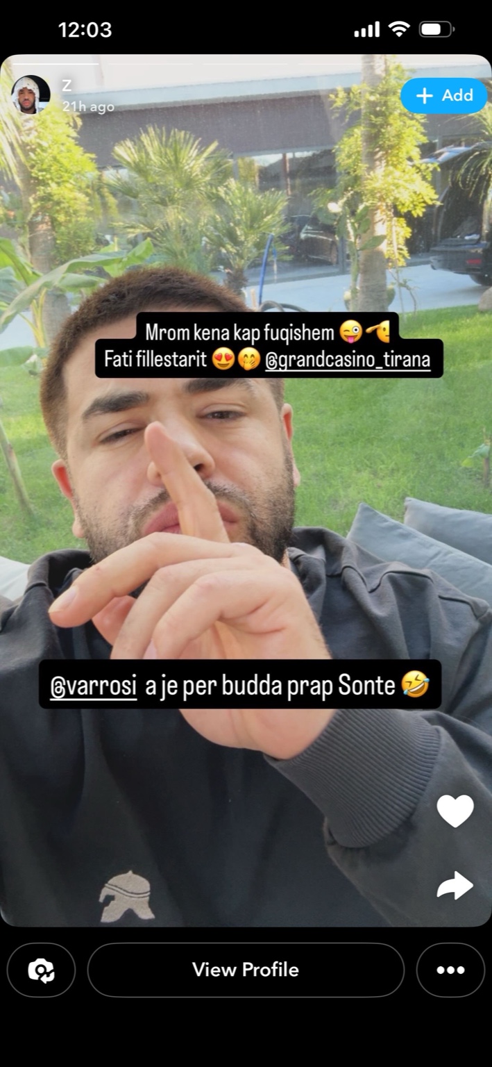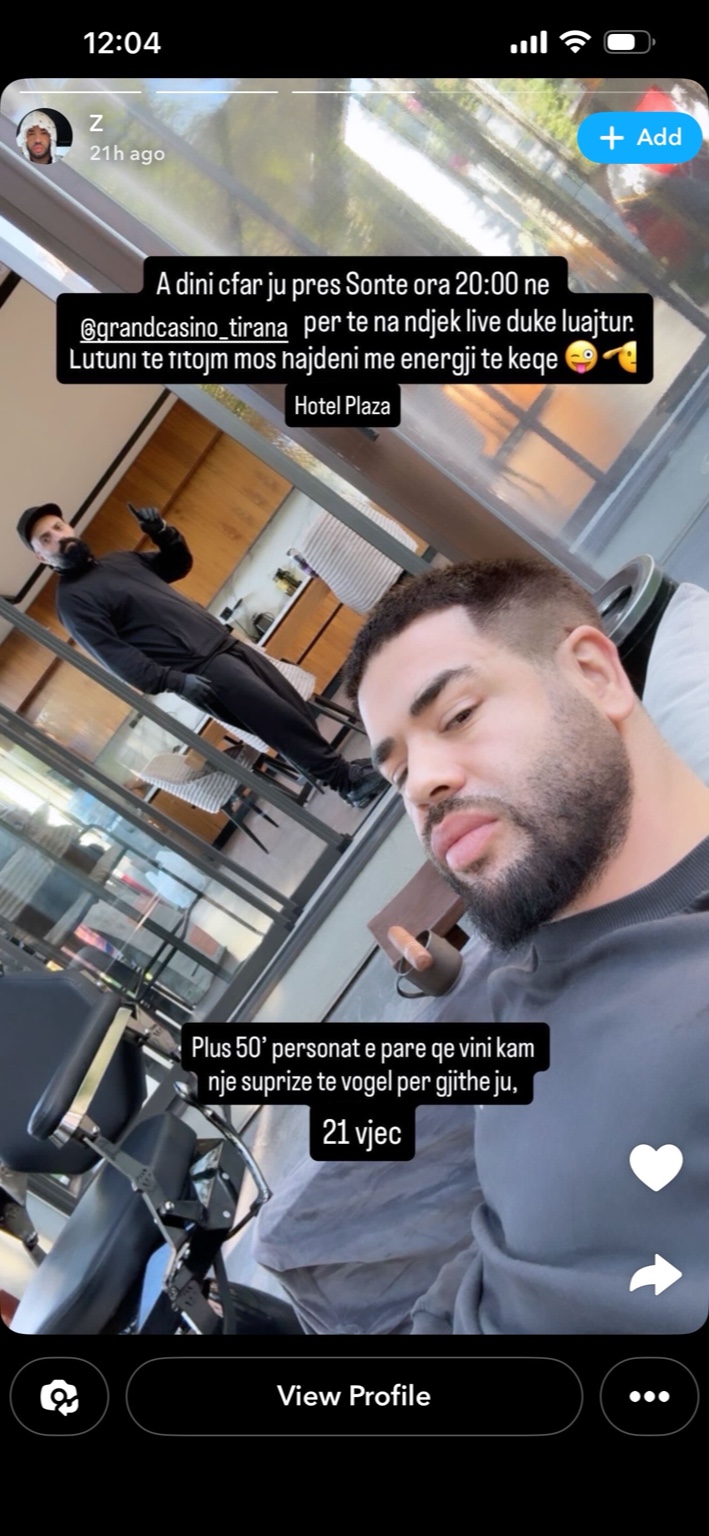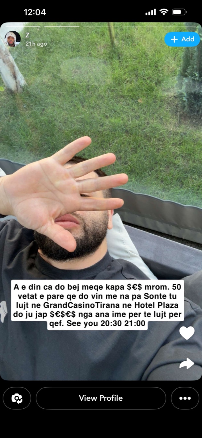 “A e din ça do bëj meqë kapa leke mrom? 50 vetat e pare qe do vijne me na pa sonte tu lujt ne¨Grand Casino Tirana ne Hotel Plaza, do ju jap leke nga ana ime per te lujt per qef. See you 20:30, 21:00. Lutuni të fitojmë, mos hajdeni me energji të keqe. Plus 50 personat e pare qe vini kam nje surprize te vogel per te gjithe ju, 21 vjec.”