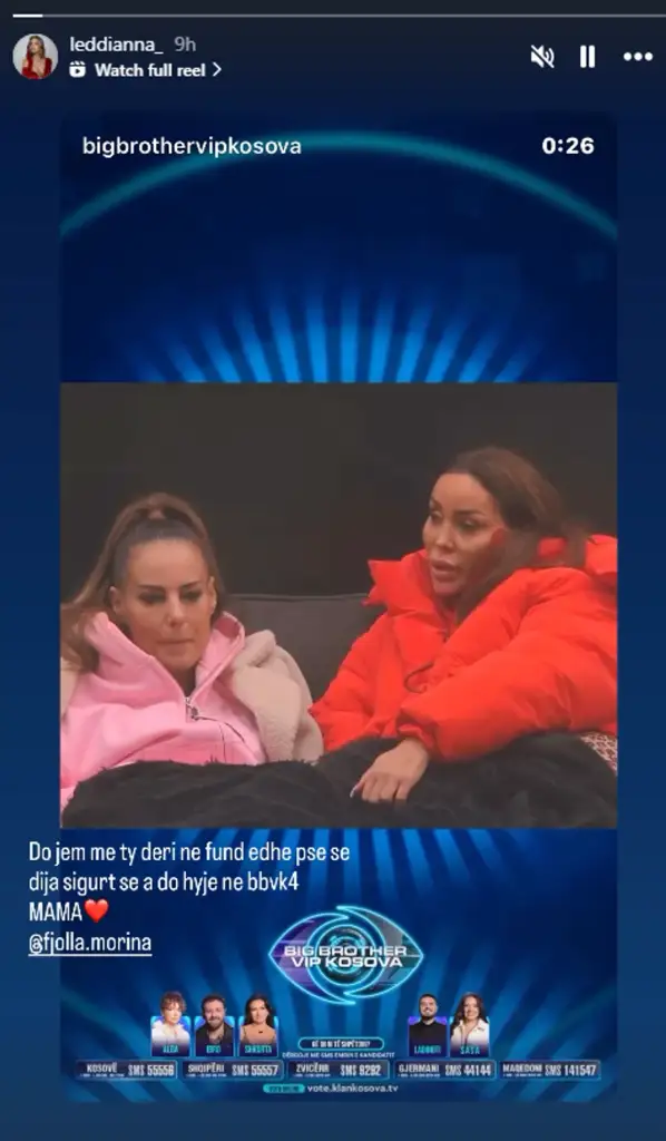 Reagimi i Ledianës nuk vonoi. Përmes një postimi në Instagram, ajo tregoi se edhe për të hyrja e nënës ishte një surprizë e vërtetë. Megjithatë, pavarësisht mungesës së informacionit, Lediana u shpreh mbështetëse ndaj Fjollës, duke shkruar: “Do jem me ty deri në fund, edhe pse s’e dija sigurt nëse do hyje në BBVK4.”