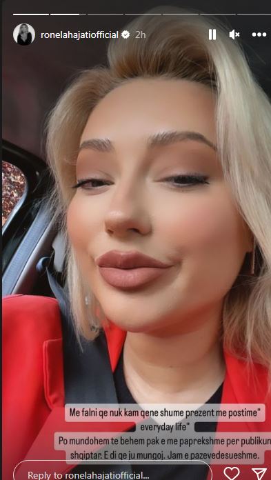Ronela Hajati u kërkon falje ndjekësve të saj. Ajo ka postuar një foto në ‘instastory’, ku shkruan se nuk ka qenë shumë prezentë në rrjetet sociale.