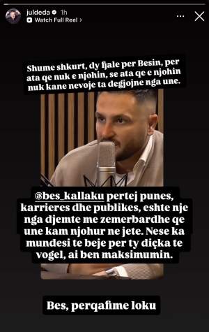 “Përtej punës, karrierës dhe publikut, Bes Kallaku është një nga djemtë me zemër më të bardhë që kam njohur në jetë. Nëse ka mundësi të bëjë për ty diçka të vogël, ai bën maksimumin,” shkruan Jul Deda krahas videos se podcastit të Grida Dumës, ku i ftuar ishte Besi.