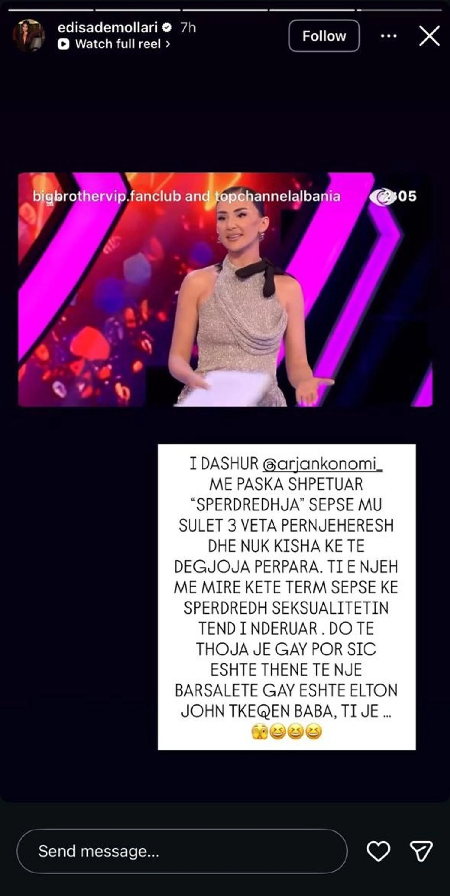 Pas përplasjeve të forta në studion e “Fan Club”, tensionet mes ish-banores së “Big Brother VIP Albania 5”, Edisa Demollari, dhe opinionistit Arjan Konomi duket se janë zhvendosur edhe në rrjetet sociale.