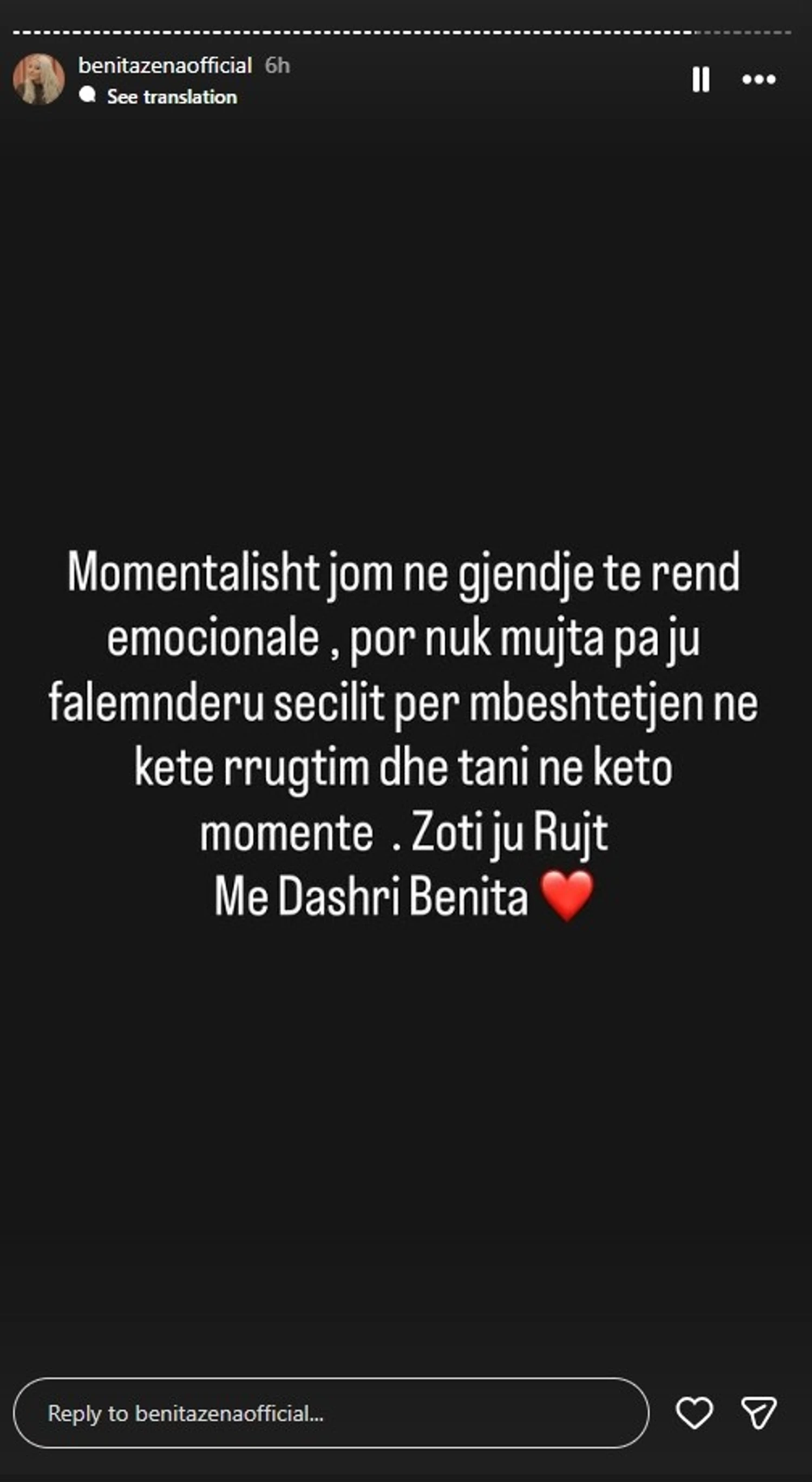 Në mesazhin e publikuar, Benita ka ndarë gjendjen e saj emocionale me ndjekësit, duke pranuar se po përjeton momente të vështira pas eliminimit. “Momentalisht jam në gjendje të rëndë emocionale, por nuk munda pa ju falënderuar secilin për mbështetjen në këtë rrugëtim dhe tani në këto momente. Zoti ju ruajtë”, ka shkruar ajo, duke reflektuar sinqeritet dhe ndjeshmëri për gjithçka ka kaluar brenda shtëpisë.