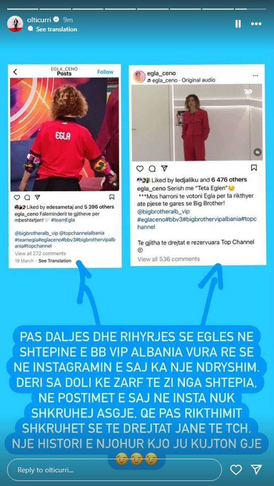 “Pas daljes dhe rihyrjes së Eglës në shtëpinë e BB VIP ALBANIA, vura re se në Instagramin e saj ka një ndryshim. Derisa doli me zarf të zi nga shtëpia, në postimet e saj në Insta nuk shkruhej asgjë. Që pas rikthimit shkruhet se të drejtat janë të TCH. Një histori e njohur kjo, ju kujton gjë?”- shkruan Olti, duke na kujtuar sigurisht, Luizin!