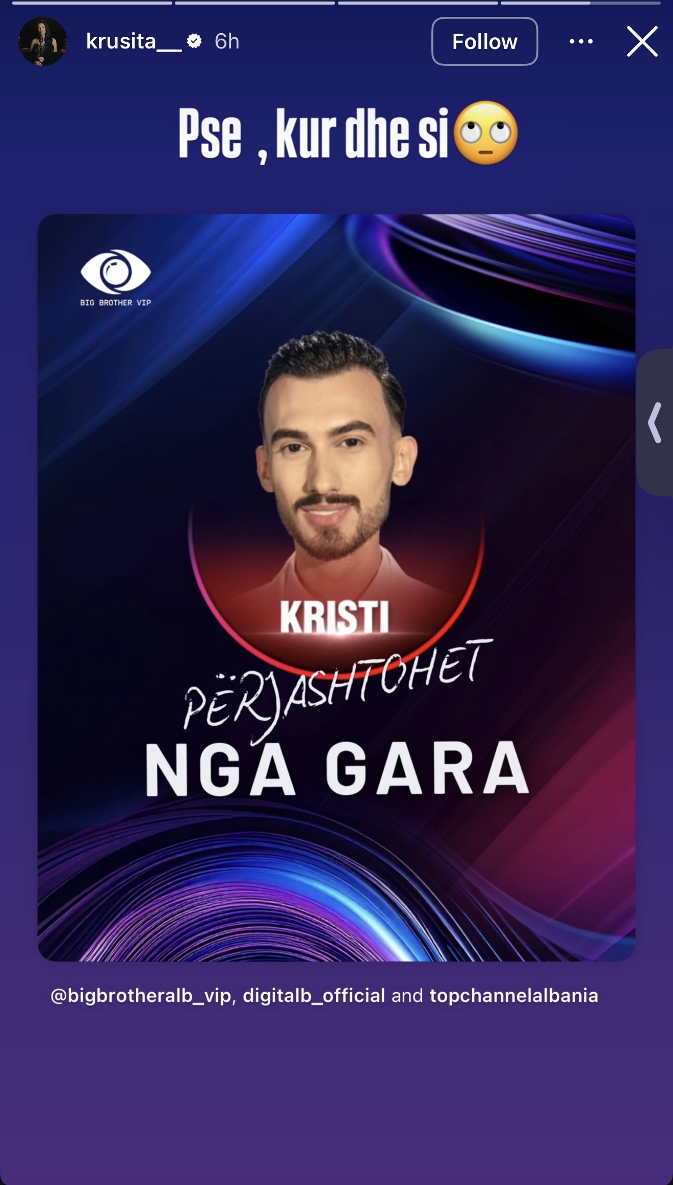 Pas përjashtimit të papritur të Kristi Lamajt nga “Big Brother VIP Albania”, reagimi i parë publik ka ardhur nga Krusita, me të cilën ai kishte krijuar një lidhje të ngushtë brenda shtëpisë. Përmes një postimi në rrjetet sociale, ajo ka shprehur hapur habinë e saj, duke shkruar thjesht: “Pse, kur dhe si”.